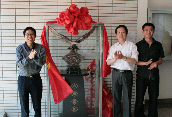 经理助理陆志东,土木工程系党总支书记王锦麒和毕业生代表聂浩同学共同为雕塑揭幕。这座雕塑名为“大展宏图”,鹰是民族图腾,国家象征,有着深厚的文化内涵;她象征着勇于开拓,不断进取之精神,也表达了同学们立志踏入社会后,以鹰的精神不断激励自己,发奋努力,搏击苍穹,以骄人的成就回报母校、回报社会。