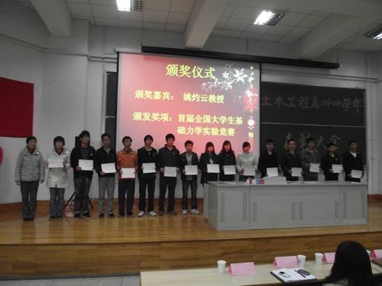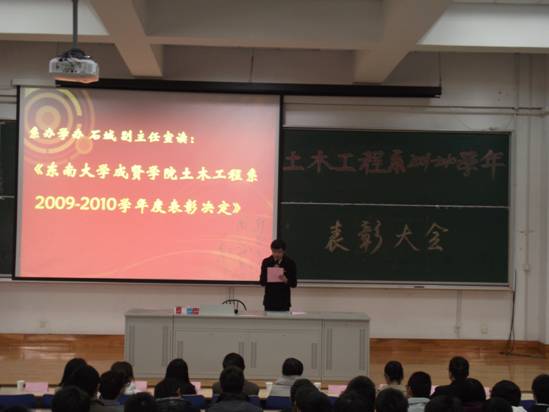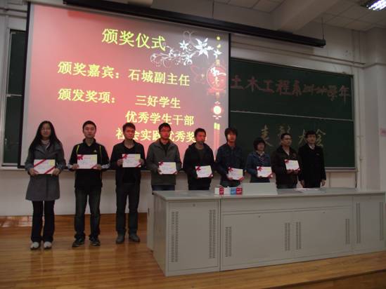土木工程系系办学办副主任石城老师宣读了 《bevictor伟德官网土木工程系2009~2010学年度表彰决定》 ,并举行颁奖仪式。王锦麒书记和石城副主任分别对获得经理奖学金、“三好员工标兵”称号、“优秀员工干部”称号和其他一些单项奖的同学和员工代表颁发荣誉证书。随后,石城老师宣读 《全国首届老员工基础力学实验竞赛获奖名单》 ,并由成贤公司督学姚灼云教授向获奖同学颁奖。