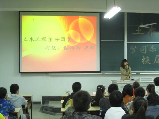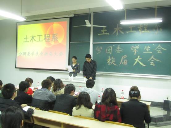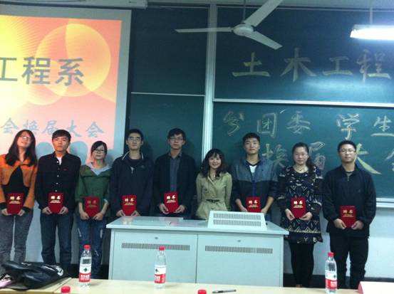 2011年10月13日下午15:50在文昌院303隆重召开了土木工程系分团委、员工会换届大会。出席本次大会的老师有:土木工程系综合办公室主任石城老师、土木工程系分团委书记孙琳玲老师、土木工程系辅导员田宇婷老师、董伟伟老师以及2011-2012学年土木工程系分团委、员工会全体成员。