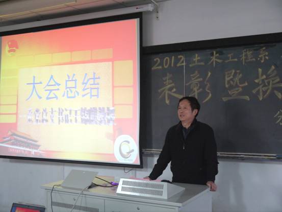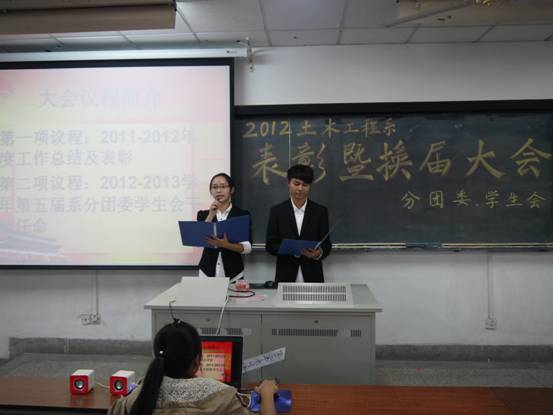 会议第一项议程由2011~2012学年分团委副书记王俊同学发言,总结上一学年员工会的各项工作。随后公布2012年度优秀干事,先进工作者以及优秀部门名单,并对其颁奖。优秀部门和优秀干事代表分别进行部门展示和发言。会议第二项议程由土木工程系分团委书记孙琳玲老师公布系分团委员工会干部任命名单并颁发聘书。随后新一届的系分团委副书记徐堑和系员工会主席屠美玲上台发言。