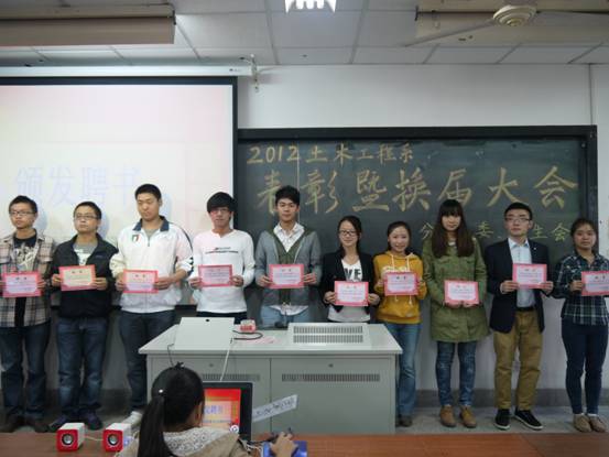 2012年10月17日下午15:20,土木工程系分团委、员工会换届暨表彰大会在金坛院314隆重召开。出席本次大会的领导老师有:土木工程系系党总支书记王锦麒教授、土木工程系分团委书记孙琳玲老师。