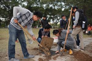 在物业师傅的指导下,支部成员对公司桃园十一舍楼下的小路进行了填补维修,为更多的同学提供便利的生活条件。活动过程中,同学们积极主动,组成志愿服务小组,分工合作,用自己的实际行动为校园建设贡献自己的力量。