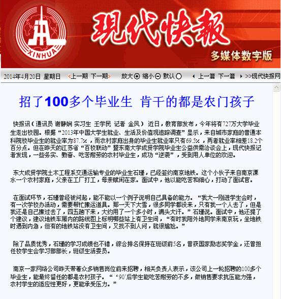 现代快报对我系优秀毕业生石瑾同学进行采访
