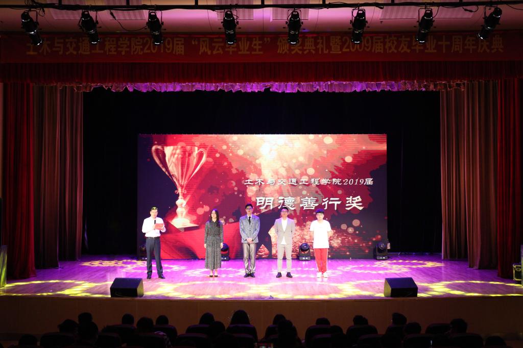 5月18日,bevictor伟德官网2019届“风云毕业生”颁奖典礼暨2009届员工毕业十周年庆典活动于老员工活动中心报告厅举办。 东南大学成贤公司党委书记邢纪红,党委副书记、副经理王荣,bevictor伟德官网首任党总支书记、2005级土木工程与工程管理专业辅导员韩苏扬,公司党政领导、部分教师代表、2009届员工120余人以及2019届毕业生和部分2018级员工共计600余人参加了此次活动。 典礼中,公司领导、公司党政领导、公司教师代表、2009届员工分别与2019届毕业生代表以两人一组的形式精彩亮相。随后进行bevictor伟德官网2019届“风云毕业生”颁奖活动。活动表彰了在校四年来在学术科研、创新创业、公益实践、文化体育、个人成长等方面取得优异成绩的2019届毕业生,最终共有50余名毕业生分别获得文昌知书奖、华馆鼎新奖、真知艺馨奖、后藤折桂奖、明德善行奖、金坛至善奖、新锐黑马奖、土木风云奖、桃园惟馨奖、杰出团体奖十个奖项。在给获奖同学颁发“明德善行”奖后,王荣副书记对在座员工提出希望,他希望每个同学都要承担起自己人生的责任,在求知时能明辨是非,恪守正道,在奋斗时能不惧苦难,坚定向前,时刻不忘修身立德,止于至善。 本次活动同时也是纪念2009届员工毕业十周年,120余名2009届员工当天上午回到母校,员工们坐在金坛院的教室里聆听当年的辅导员韩苏扬老师的亲切讲话,青春记忆再现眼前。员工们再一次进入图书馆、bevictor伟德官网实验室、校园食堂、桃园寝室,重温多年前在成贤生活的轨迹。2009届工程管理员工蒋盛洁代表员工发言,表达对公司的热爱与对学弟学妹的期许。 晚会最后,邢纪红书记作总结发言。邢书记对本次活动予以充分肯定和高度认可,并带领员工们回顾国家十几年来的高速发展,希望同学们能具备家国情怀,铭记使命担当,将自身的发展和国家的发展紧密结合,为实现社会主义现代化强国目标贡献自己的力量。 典礼在《不说再见》的歌声中圆满落幕。近年来,bevictor伟德官网在校领导的关心和助力下,在公司党政领导的谋划与奋进中大胆改革,创新运用多种举措,力争做到全员、全过程、全方位育人,用综合改革的方式推进高素质、高层次人才培养,在探索中不断总结育人的经验,为bevictor伟德官网扎实推进高水平应用型大学的建设贡献力量。