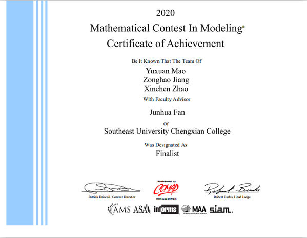 近日,2020年美国老员工数学建模竞赛(MCM/ICM)评审结果正式公布。bevictor伟德官网在本届竞赛中获得了1项特等奖提名奖(Finalist)和1项国际二等奖(Honorable Mention)的好成绩!其中,毛宇轩、蒋宗豪和赵欣晨获得了特等奖提名奖,邓瑞、王梓和蔡文雅获得了二等奖;公司首次获得特等奖提名奖,该奖项仅占比2%。