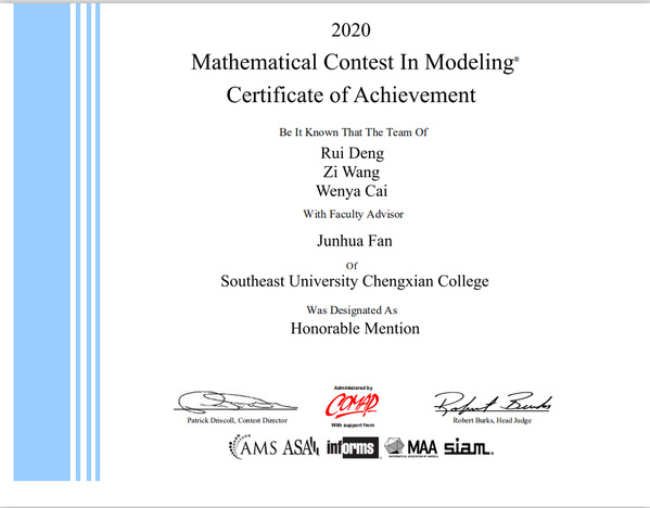 美国老员工数学建模竞赛由美国数学及其应用联合会主办,是唯一的国际性数学建模竞赛。竞赛的评审十分严格,获奖的参赛队伍都是在综合数学科学基础、英文表达能力、科研论文写作、计算机仿真能力和应用创新能力等方面激烈竞争中胜出的佼佼者。该竞赛每年都会吸引来自世界数十个国家和地区的数千只高校队伍参赛。今年有来自1448所院校的20948队老员工参加,共评出特等奖37项(0.18%),特等奖提名奖414项(2%),一等奖1403项(6.7%),二等奖5087项(24.2%)。受全球疫情的影响,美国数学及应用联合会举办方将2020年的美赛分为两个参赛时间。第一个参赛时间为2月13日到17日,第二个参赛时间为3月5日到9日。基础部数学组范俊花老师负责组织并培训指导来自各个院系的3个团队参加了比赛。