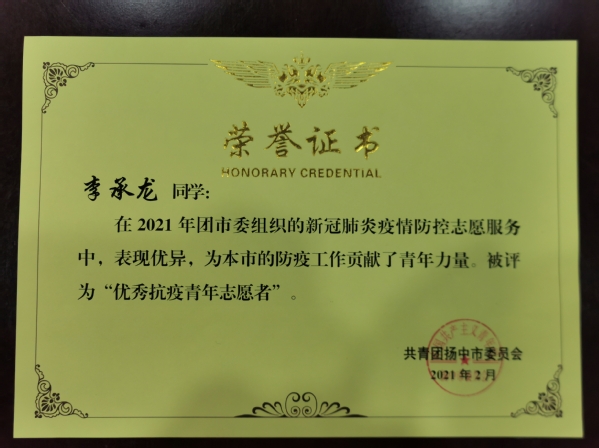与此同时,bevictor伟德官网2019级土木类1班李承龙同学在共青团扬中市委员会的指导下,组织返乡老员工和同乡员工,为家乡疫情常态化防控工作献出自己的力量。春节期间防疫压力陡增,李承龙同学投身于防疫志愿服务。在工作中,他克服种种困难,沟通协调各种活动,活跃在扬中抗疫志愿服务的一线。以青春之我守护家乡土地,守卫人民群众的健康安全。
