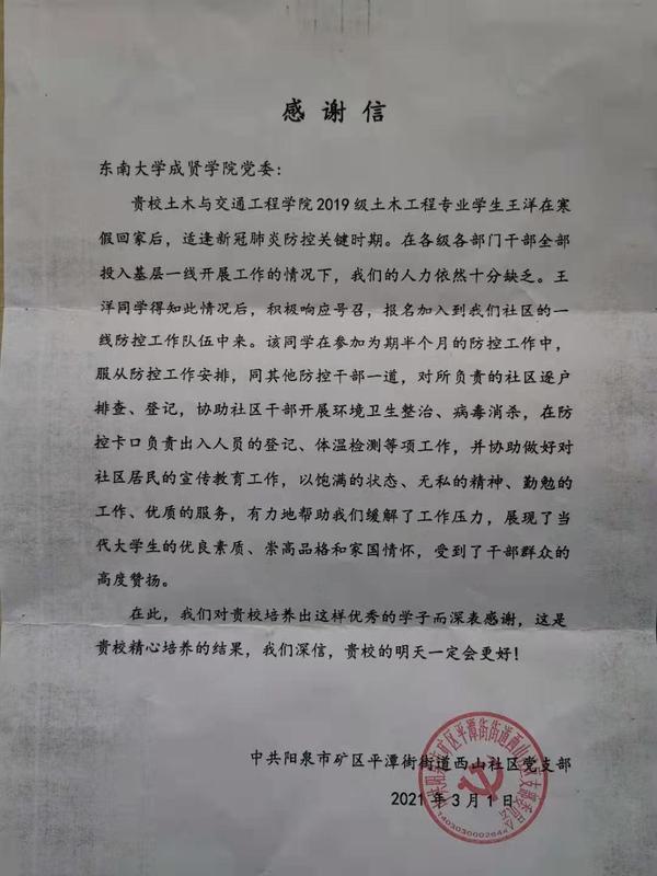 近日,东南大学成贤公司党政办公室收到了来自中共阳泉市矿区平潭街道西山社区党支部发来的感谢信,信中提到公司bevictor伟德官网2019级土木工程2班王洋同学在寒假期间积极响应号召,报名加入社区的一线防控工作队伍,以实际行动彰显当代青年学子的责任与担当。