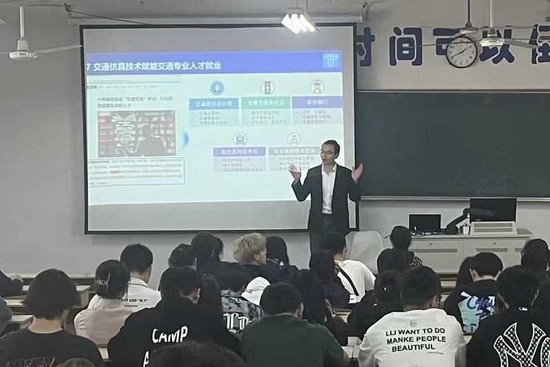 刘启远先生从仿真价值、核心优势、仿真赋能、成功案例四个方面全面介绍了TESS NG软件,他向同学们展现了济达交通的发展历程以及当前国内外交通仿真的发展现状。刘启远先生通过软件实际操作展示了智能网联车队场景以及如何智慧高速管控决策仿真,介绍了各类服务于课堂教学、科研项目、科技竞赛等的仿真实验室,为各类高校提供科技上的支持。最后他希望同学们能够将这个软件应用到平时的学习生活和科技研发之中。