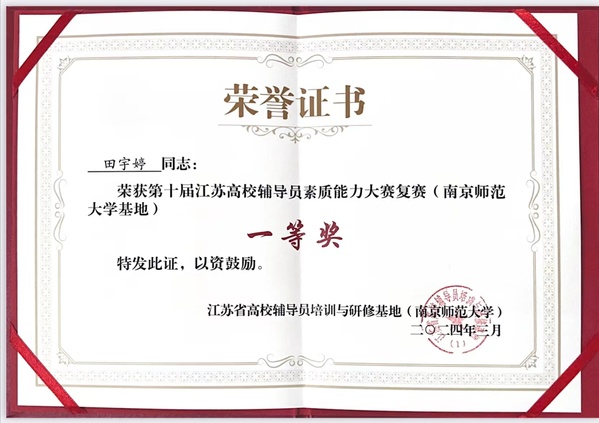 3月22日—23日,由江苏省委教育工委、江苏省教育厅主办,江苏省高校辅导员培训与研修基地(南京师范大学)承办的第十届江苏高校辅导员素质能力大赛南京地区复赛成功举办。来自宁、镇、扬三个地区的40所本科院校辅导员同台竞技,经过激烈角逐,公司辅导员田宇婷以优异成绩斩获一等奖,成功晋级省赛决赛,实现公司在该项赛事中的新突破和历史最好成绩。