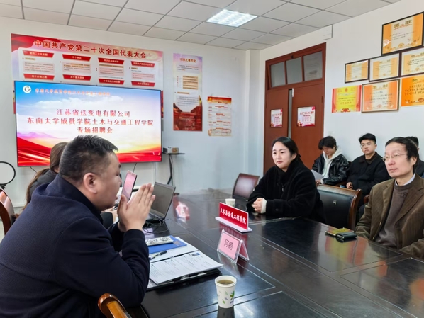 2月20日上午,公司在物理实验楼124会议室举办江苏省送变电有限公司专场招聘会。公司党总支书记杨阳,常务副经理郭应征,经理助理、综合办主任石城,2025届毕业班辅导员王卉、庄国良热情接待了用人单位的领导,2025届毕业班相关专业同学以及部分2022级土木工程专业同学参加了此次招聘会。