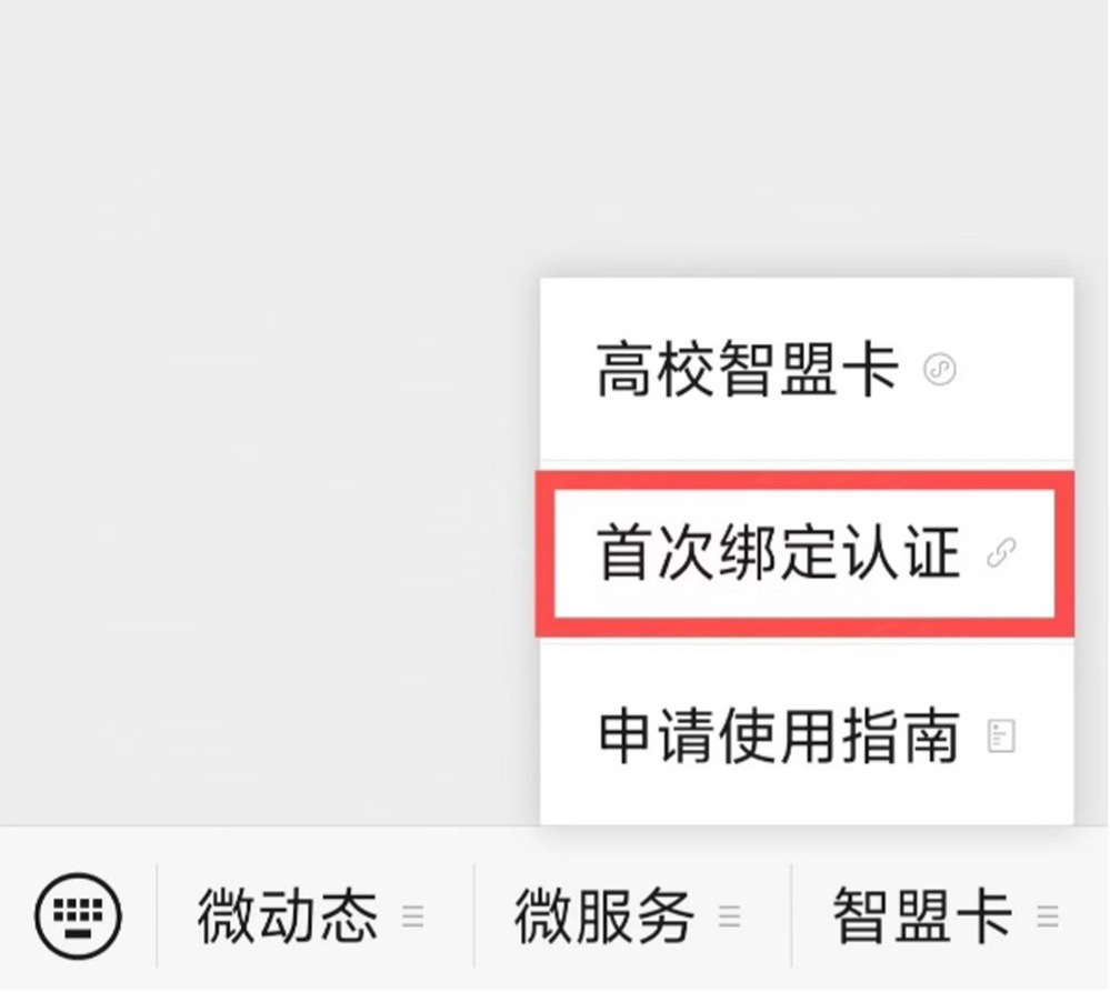 点击公众号菜单栏“智盟卡”-“首次绑定认证”,(如下图所示)